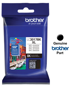 This genuine LC3017BK (XL) (550 Yield) OEM Brother ink cartridge will not void your machine's warranty and is backed by the manufacturer guarantee.