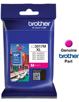 This genuine LC3017M (XL) (550 Yield) OEM Brother ink cartridge will not void your machine's warranty and is backed by the manufacturer guarantee.