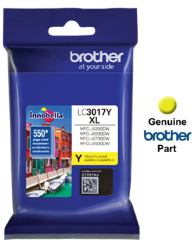 This genuine LC3017Y (XL) (550 Yield) OEM Brother ink cartridge will not void your machine's warranty and is backed by the manufacturer guarantee.