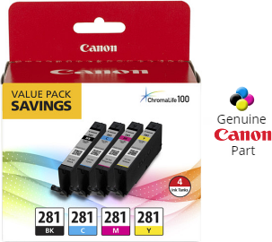 These genuine CLI-281 (2088C001, 2089C001, 2090C001, 2091C001) (5.6 mL each) OEM Canon ink tanks will not void your machine's warranty and are backed by the manufacturer guarantee.