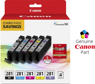 These genuine CLI-281 (2088C001, 2089C001, 2090C001, 2091C001, 2092C001) (5.6 mL each) OEM Canon ink tanks will not void your machine's warranty and are backed by the manufacturer guarantee.