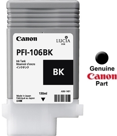 This genuine PFI-106BK (6621B001) (130ml) OEM Canon ink cartridge will not void your machine's warranty and is backed by the manufacturer guarantee.