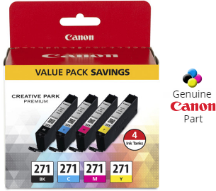 These are Genuine Canon standard yield ink cartridges that are formulated for use in the Canon printers listed below. The CLI-271 Inks deliver improved color, a wider color gamut, and better color fastness over previous generation inks. Genuine Canon ink tanks allow you to access free exciting premium content via Creative Park Premium, and the smart LED lets you know when a tank is installed properly, and which ink tanks need to be replaced.