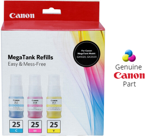 OEM 3-pack: Canon MAXIFY GX1020/ GX2020 Original Cyan, Magenta and Yellow Ink Bottles, 25 C M Y (6277C002; GI-25, 6277C001, 6278C001, 6279C001)