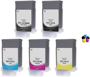 Our premium quality compatible Canon PFI-107MBK/ PFI-107BK/ PFI-107C/ PFI-107M/ PFI-107Y (130ml each) ink cartridges will not void your machine's warranty and are backed by a 100% quality and satisfaction guarantee for one full year. Click here for details.