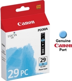 This is a genuine OEM Canon LUCIA photo cyan ink tank that's formulated for use in the printers listed below. Part of Canon's 12 LUCIA Pigment Ink System that helps professionals achieve gallery-quality result by expanding the color possibilities, the PGI-29 LUCIA Ink Tanks are approximately 155% larger than previous ink tanks, and almost 40% larger than the ink tanks used by select competitors. Larger individual ink tanks provide greater value as less time is required replacing inks, that way more time can be spent printing.
