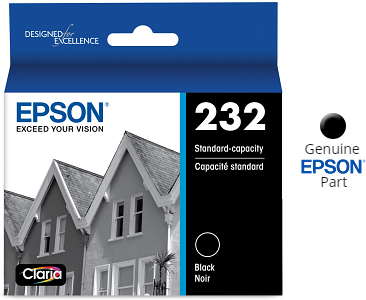 This Genuine Epson 232 standard capacity black ink cartridge that's formulated for use in the Epson printers listed below. With three individual dye-color ink cartridges (Cyan, Magenta, Yellow) and one pigment Black ink cartridge, this Claria Ink set delivers vibrant color and sharp text for long-lasting, high quality results.