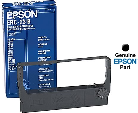 This is a genuine Epson ERC-23 B (ERC-23B, ERC23B) OEM black fabric ribbon cartridge that's guaranteed by the manufacturer to generate optimum print quality and give you maximum productivity.