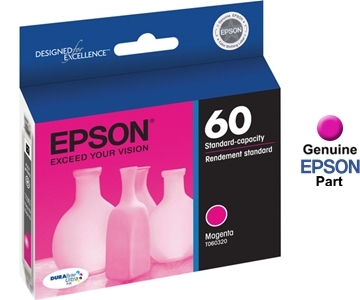 This is a genuine OEM Epson magenta ink cartridge that's formulated for use in the printers listed below. With the Epson 60 Magenta Ink Cartridge, you get bold, magenta text and rich, vibrant colors, for results you'll enjoy for years to come. DURABrite is also water and smudge resistant, which prevents accidental damage caused by moisture and spills. What's more, DURABrite is fade resistant, so your cherished photos and important documents will stand up to harsh outdoor sun or indoor lighting.