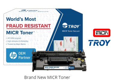 TROY MICR Toner Secure™ was created to help prevent check fraud. The patented security agent forces a bright red stain to permeate through the check if chemical alteration is attempted.