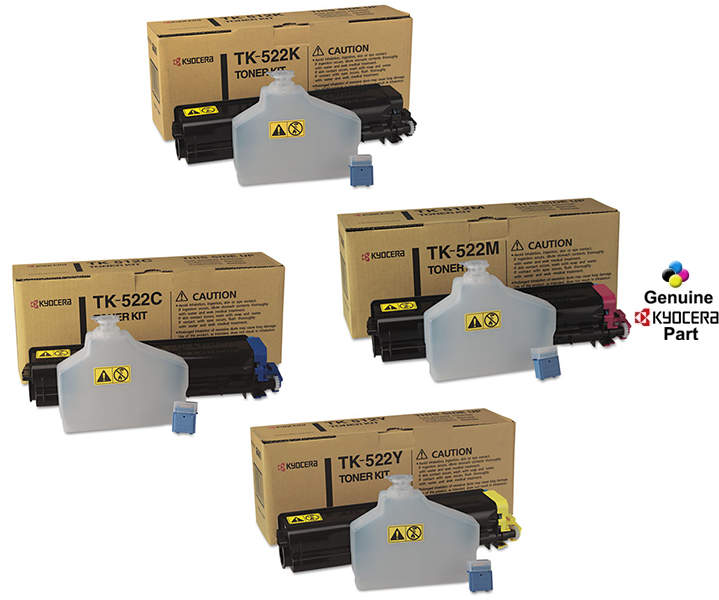 OEM 4-Pack: Black, Cyan, Magenta & Yellow Kyocera FS-C5015N Original Toner Cartridges, TK-522K/ TK-522C/ TK-522M/ TK-522Y