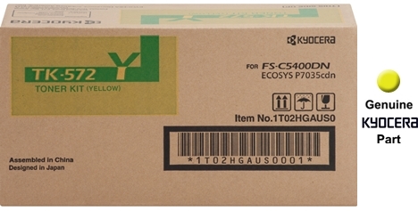 This genuine TK572Y (TK-572Y, 1T02HGAUS0) (12,000 Yield) OEM Kyocera toner will not void your machine's warranty and is backed by the manufacturer guarantee.