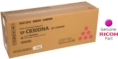 This genuine Ricoh 821183 (821119, SP C830DNA) OEM magenta print (toner) cartridge will not void your machine's warranty and is backed by the manufacturer guarantee.