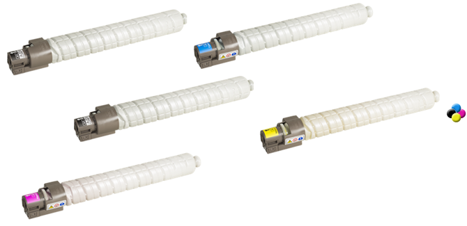 These are premium quality compatible Ricoh Aficio MP C3002/ MP C3502 print (toner) cartridges, with chips that communicate with the copier, that are 100% guaranteed to perform as well as the Ricoh brand cartridges - at a fraction of the cost.